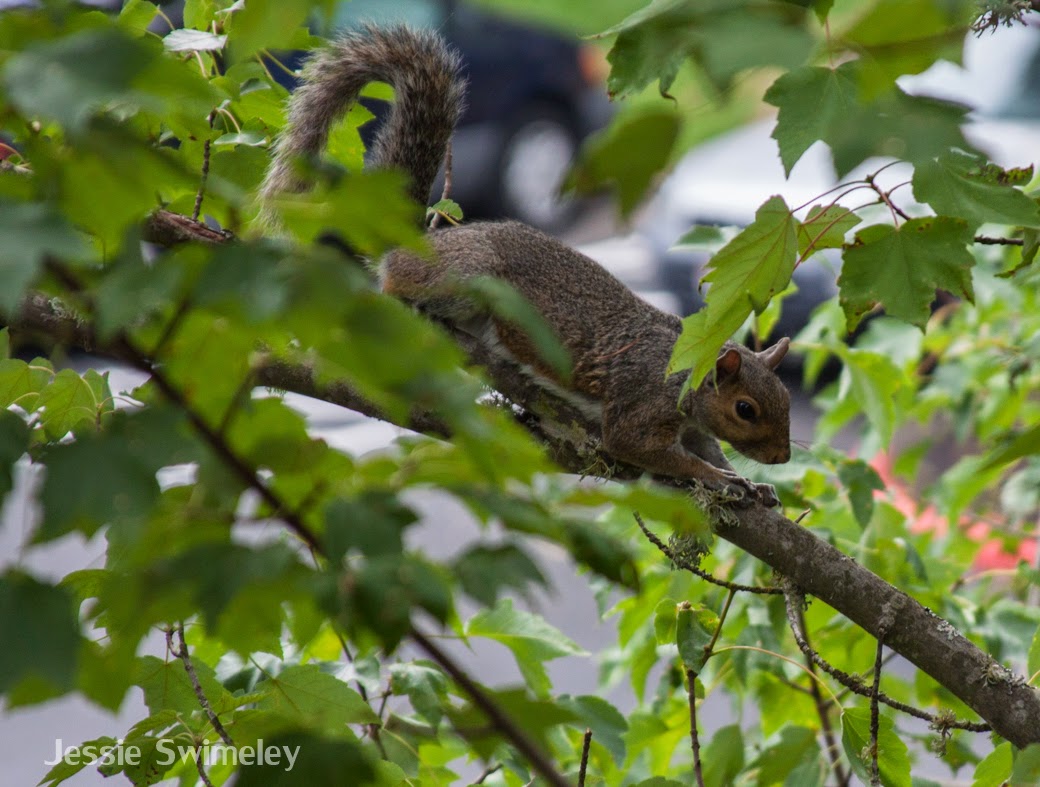 When we returned home Joel noticed that a squirrel was building a nest in the tree right outside our front door!